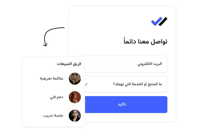 بدل التحويلات المتكررة وانتظار الرد، خل عملاءك يعبون نموذج قصير يحدد احتياجهم بدقة. جدولة توجههم تلقائيا الى الشخص الانسب — مبيعات، دعم فني، او جلسة تدريب — فتختصر وقت الفريق، وتحل المشكلة اسرع، وترفع رضا العميل من اول تواصل